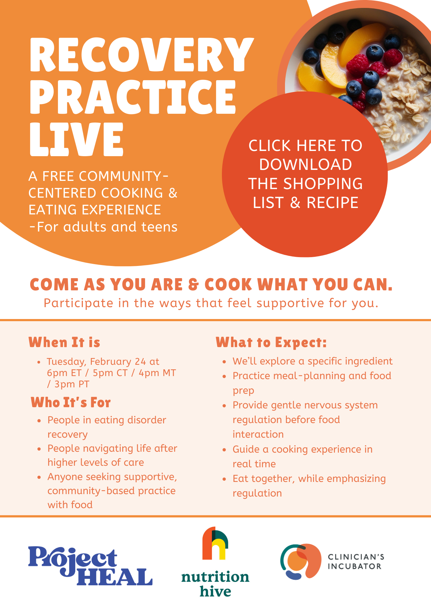 Recovery Practice Live is a community-based, hands-on cooking and eating session. It combines mindfulness, nutrition education, and gentle body-based support. The goal is to help participants feel safer, more curious, and more at ease around food.